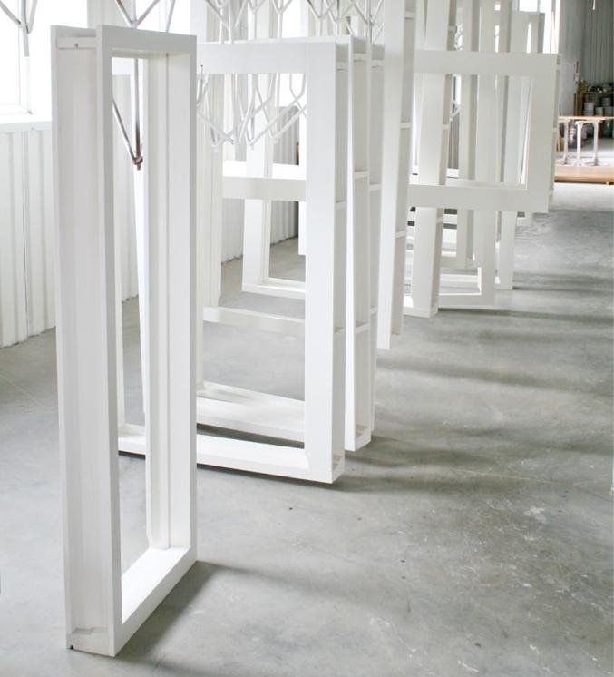 Semi-automatic painting line operating by high qualified specialists and robots. Windows are painted with water based micro-porous paint.